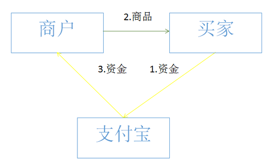 这样的模式是一方面极大的推动了我国电商行业的发展,另一方面也避免了卖家有跑路的可能,即使卖家跑路了,买家也可能向支付宝索取回相关损失,因为支付宝将买卖双方的信用等级升级成了支付宝的金融信用,其具体模式见下图: