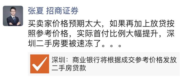 招商证券首席分析师张夏老师在朋友圈分析称,买卖家价格预期太大,如果再加上放贷按照参考价格,实际首付比例大幅提升,深圳二手房要被速冻了。。