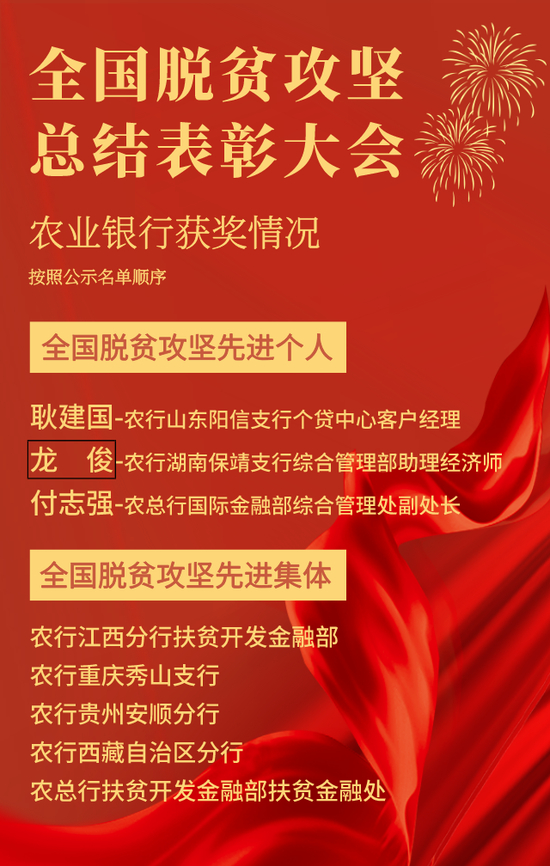 原标题:喜报!农业银行3个人5集体获全国脱贫攻坚先进荣誉称号