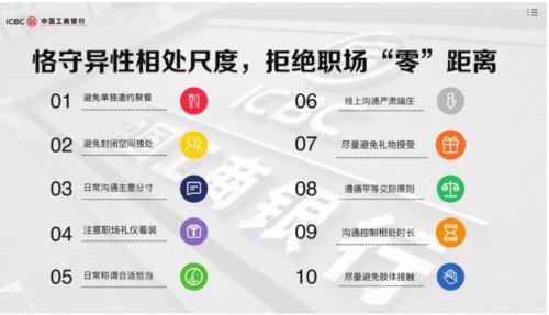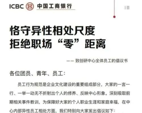 据网友们透露,这次博人眼球的是工行网络金融部创研中心内部发的一封名为《恪守异性相处尺度 拒绝职场“零”距离》(下称“倡议书”)的倡议书,引发了大众对职场相处话题的热切关注。
