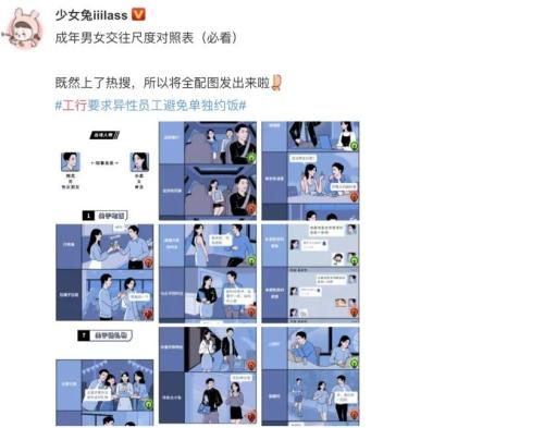 值得一提的是,该份倡议书还结合漫画的形式,对异性交往尺度进行了展示,列出了涉及吃饭、搭顺风车、帮忙等十个场合中的“规范”做法。据了解,该组漫画由知名博主@少女兔iiilass原创。
