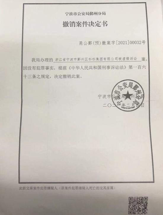 高央向澎湃新闻提供的一份宁波市公安局鄞州分局今年2月4日出具的《撤销案件决定书》显示,宁波市公安局鄞州分局办理的浙江省宁波市鄞州区杉杉集团有限公司被虚假诉讼案,因没有犯罪事实,根据《中华人民共和国刑事诉讼法》第一百六十三条之规定,决定撤销此案。