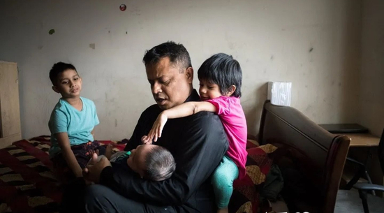 图来源:纽约时报;穆罕默德·霍克和他的三个孩子在他们位于纽约皇后区牙买加的单间公寓里。