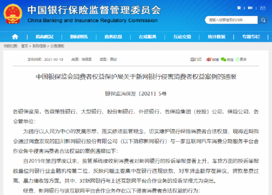 今日,中国银保监会消费者权益保护局又通报了一则侵害消费者合法权益的案例:新网银行因存在违规放款、对车贷金额存在异议、贷款息费过高、暴力催收等问题,被点名批评。
