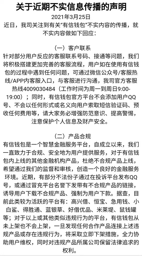 事实上,上述网友遭遇的情况并非个例。3月18日,另一网友也在黑猫投诉发帖反馈,“有信钱包”故意链接黑网贷“恒宝”App强制下款1000元,两天让还1800元,现在找不到还款路径。探长读财注意到,有信钱包被曝光之后,3月25日,其在官方微信公众号“有信管家”发布声明如下: