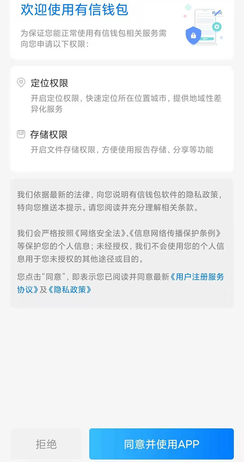 有信钱包真有自己说的那么正规和无辜吗?探长读财下载并安装有信钱包发现,首次打开有信钱包APP必须同意其《用户注册服务协议》和《隐私政策》,并开启定位权限和存储权限,如果点击“拒绝”将无法使用APP。