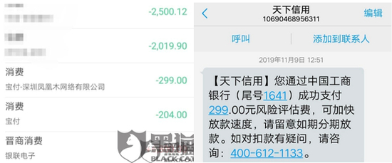 以如期分期为例,在黑猫平台共有460条投诉,涉及合作伙伴包括晋商消金,天下信用(鹏元征信旗下)。3月15日,网友发帖投诉,其通过如期分期贷款6800元,刚下款就被扣走503元。其中,299元由天下信用经宝付收取,另外204元由如期分期经宝付扣走。
