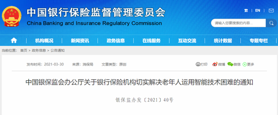 3月30日,银保监会发布《中国银保监会办公厅关于银行保险机构切实解决老年人运用智能技术困难的通知》(以下简称《通知》),对保留和改进传统金融服务方式、提升网络消费便利化水平、推进互联网应用适老化改造等方面提出了16条明确要求