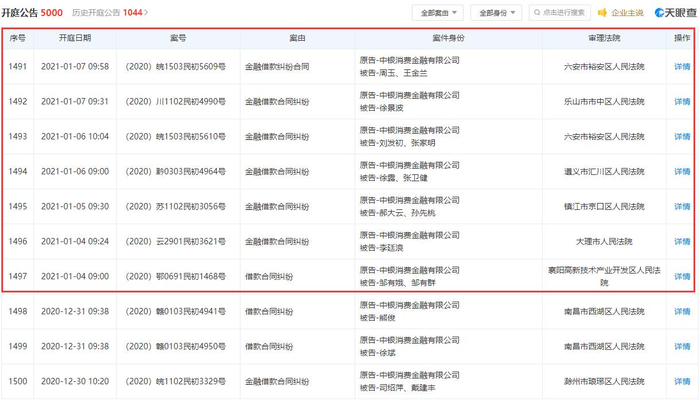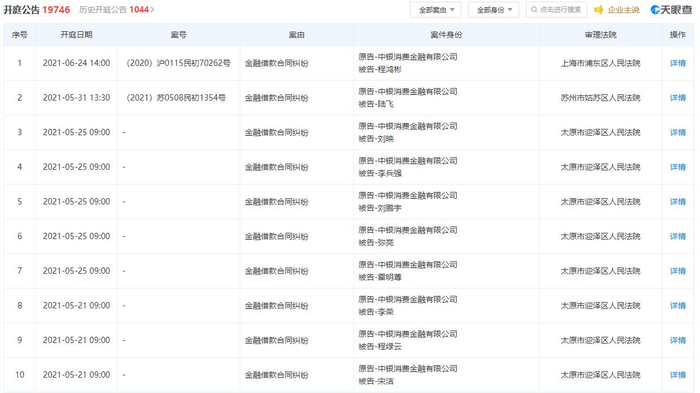 天眼查显示,中银消费金融的开庭日期已排到6月份,案由多数为金融借款合同纠纷。开庭日期从2021年1月4日到6月24日,共有1497起开庭公告。
