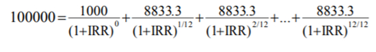 借款人需在借款当期一次性支付手续费等与贷款直接相关 的费用,并在还款期内,分期偿还一定数额的本金和费用。例如,某消费金融公司贷款,期限为 1 年,按月还款,共 12 期,本金为 10 万元。按照还款计划,借款人在借款当期一次性支 付 1000 元服务费,并从借款后第一个月末起,每月等额偿还 8833.3 元,其中本金 100000/12=8333.3 元,分期费(按初始贷款本金的 0.5%计算)100000*0.5%=500 元。上述贷款以单利计算的综合年化利率约为 12.80%。以 IRR 方法计算的综合年化利率约为 13.58%,计算过程为: