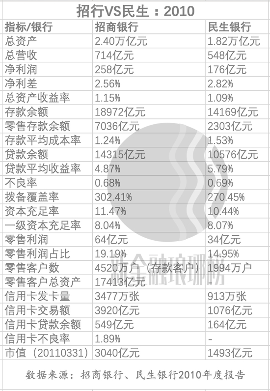 基于2010年报与2020年报,新金融琅琊榜整理出了两张民生VS招行的业务数据对比图。