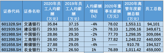 国有六大行中2020年人均薪酬皆超过25万元,交通银行人均薪酬最高,为35.84万元,建设银行第二,为29.93万元,中国银行排名第三,人均28.86万元。