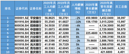 看完券商再看银行,从2020年前十大银行薪酬榜单可以看出,2020年人均薪酬最高的是平安银行,人均56.86万元;浙商银行紧随其后,人均55.25万元;招商银行以人均54.5万元排名第三。