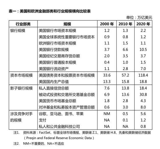 如下表所载数据显示:在过去的20年时间里,美国和欧洲的金融脱媒在持续加速。美国和欧洲的银行在其金融体系中扮演的角色越来越小。就规模而言,美国和欧洲的银行的规模相对于多个市场整体指标占比由持续缩小的趋势。这种变化趋势的体现,从影子银行到金融科技竞争对手,再到整个金融市场。