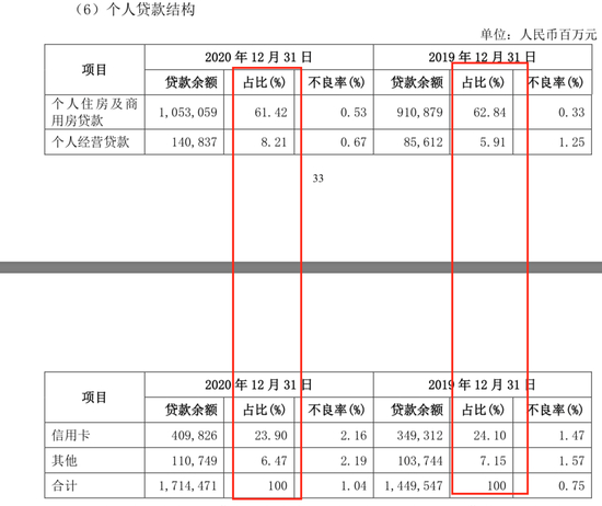 而平安银行个人贷款结构中,房屋按揭贷款及信用卡应收贷款依然占据前两位,两者合计占个人贷款40%的比重,不过,房屋按揭贷款由2019年的17.7%升至2020年的19.8%,而信用卡应收账款由2019年的23.3%降至2020年的19.9%。