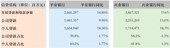 再来看兴业银行,兴业银行全年3867亿元贷款净额中,公司贷款净额2251亿元,同比增长13%,占兴业银行全年贷款净额比重58.2%,同比下滑1.3个百分点;个人贷款净额1714亿元,同比增长18.3%,占兴业银行全年贷款净额的比重41.8%,同比增加1.3个百分点。