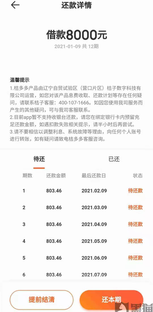 2月8日,有网友在黑猫平台发帖反馈,其今年1月9日在桔多多平台借款8000元,分12期,每期还款803.46元(据此以IRR计算,该网友在桔多多借款年率为35.94%)。现在想要提前还清,竟还要支付剩余期数的息费。