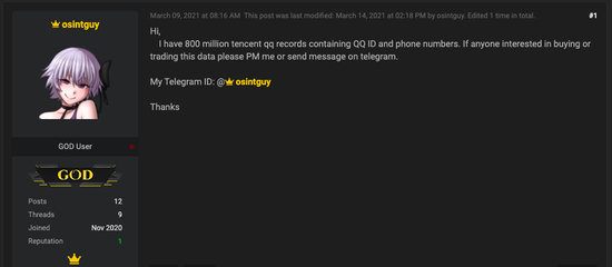 论坛中,也有账户在销售腾讯的QQ账号(未经证实),“我有8亿条腾讯QQ记录,其中包含QQ ID和电话号码。如果有人有兴趣购买或交易此数据,请留言联系我或通过电报发送消息。”