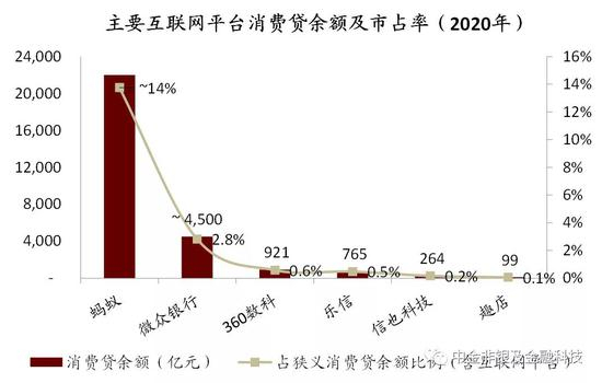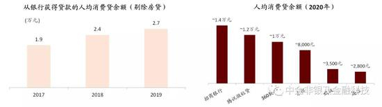 资料来源:央行,公司公告,中金公司研究部;注:1)招行基于剔除个人经营贷&住房贷款的消费贷余额、按信用卡流通户数测算;2)微众银行微粒贷截至2019年末的估算;3)360数科、乐信基于我们估算;5)蚂蚁基于截至1H20末的贷款余额、截至1H20末12个月期间的花呗&借呗用户数测算;6)趣店基于表内外贷款余额、在贷借款人数测算