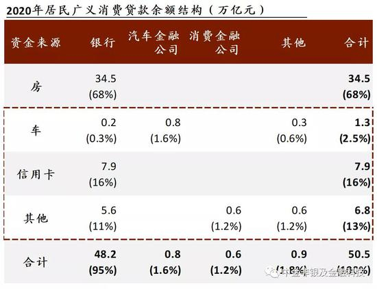 ►资产端:底层信贷产品中住房贷款占比近七成、信用卡贷款占比~1/5。广义居民消费贷款产品包括住房贷款、汽车贷款、信用卡贷款、其他消费贷款(一般用途消费品),截至2020年末占到中国整体信贷余额的28%;此外居民经营性贷款余额14万亿元、占比8%。1)2020年末广义消费贷50万亿元的规模,我们测算其中贷款产品的规模排序:房贷(35万亿元)、信用卡(8万亿元)、一般消费贷款(7万亿元)、车贷(1.3万亿元),占比分别为68%、16%、13%、2.5%。2)2020年末狭义消费贷16万亿元的规模,我们测算其中银行信用卡贷款占比最高、达49%,一般消费贷款、车贷占比分别为43%、8%。