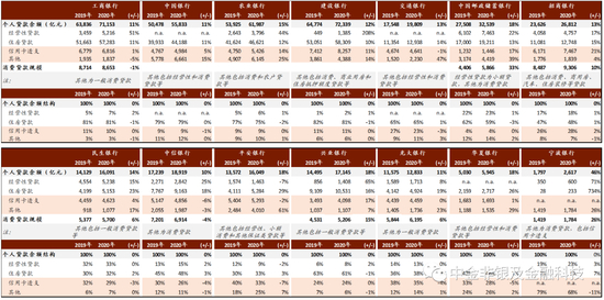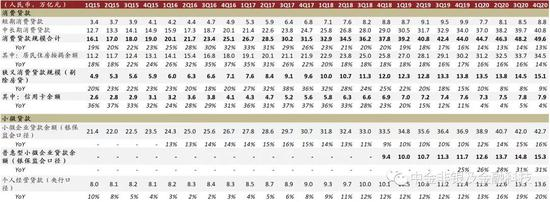 据央行统计,截至2020年末银行业存款类金融机构贷款余额48万亿元、剔除房贷后为14万亿元,其中信用卡余额8万亿元、其他一般消费贷余额6万亿元。我们整理国内上市银行个人贷款规模及结构如下(具体列示了信用卡及一般消费贷余额及规模占比):