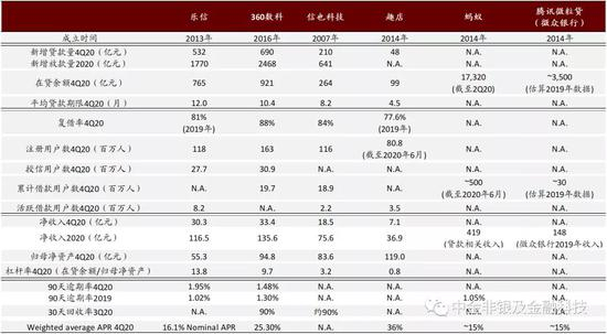 我们对比代表性国内助贷平台(乐信/360数科/信也科技/趣店/蚂蚁/腾讯微粒贷)如下: