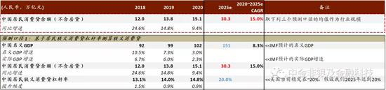 中性假设下测算:我国消费贷行业规模未来五年复合增速有望保持15%。我们基于消费贷杠杆率、债务收入比、消费贷渗透率三个维度分别测算居民狭义消费贷余额,再取三个口径的均值作为最终规模(详见下图),测算得出2025年我国居民消费贷余额(不含房贷)有望接近30万亿元,对应2020-2025年复合增速15%。