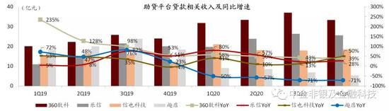 图表: 主要助贷平台贷款相关收入增速整体呈下行趋势、且平台间差异明显
