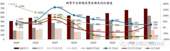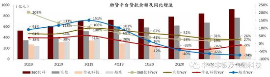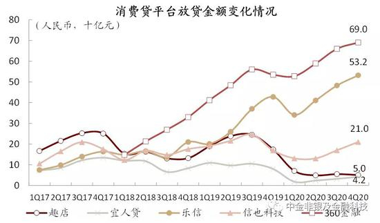 资料来源:公司公告,中金公司研究部;注:放贷金额来看,趣店包括传统小额消费贷(表内+表外)及开放平台交易金额,宜人贷自1Q19起包括宜信的贷款金额、18年及以前数据未追溯调整,乐信、360数科、信也科技包括表内及表外放贷金额
