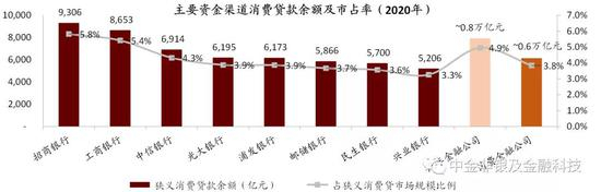 ►资金端:底层资金来源中商业银行贡献近九成、消费金融公司迅速崛起。消费信贷资金最终来源包括银行(含信用社和财务公司)、汽车金融公司、消费金融公司、小贷公司、融资租赁、ABS、信托计划等。我们测算,2020年末 50万亿元的广义消费贷余额中商业银行资金占比超过95%,而~16万亿元的狭义消费贷(剔除房贷)中,商业银行作为最大资金提供方占比85%,汽车金融公司(5%)及消费金融公司(4%)次之。其中,我们测算得招商银行/工商银行等大型银行市占率分别达5.8%/5.4%。