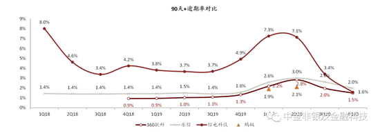 资料来源:公司公告,中金公司研究部;注:1)蚂蚁90天逾期率为截至某一日期的:逾期90天以上的贷款本金余额(扣除已核销贷款),除以由公司平台促成的贷款本金的总余额(扣除已核销贷款);2)乐信90天逾期率为截至某一日期的:逾期90-179天的贷款本金金额(扣除超过180天的预期贷款及已核销贷款,除以由公司平台促成的贷款本金的总余额(扣除逾期超过180天的贷款及已核销贷款);3)360数科90天逾期率为截至某一日期的:逾期90-179天的贷款本金金额(扣除已核销贷款及智能信贷引擎所放贷款),除以由公司平台促成的贷款本金的总余额(扣除已核销贷款及智能信贷引擎所放贷款)