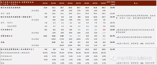 图表: 资金维度测算:银行是最大的资金提供方、消费金融公司增长迅速