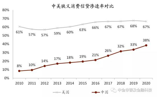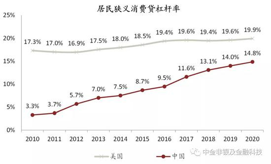 资料来源:央行,国家统计局,美联储,中金公司研究部;注:1)狭义消费信贷渗透率=剔除按揭贷款的居民消费信贷余额/社会消费品零售总额;2)未考虑部分互联网消费金融平台漏损