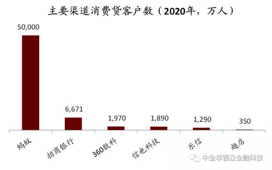 资料来源:公司公告,中金公司研究部;注:1)蚂蚁为截至2020年6月30日止12月期间的花呗&借呗用户数以及小微经营者数;2)招行为信用卡流通户数;3)360数科、信也科技(拍拍贷)为累计借款人数;4)乐信为全年活跃借款人数;5)趣店为在贷借款人数