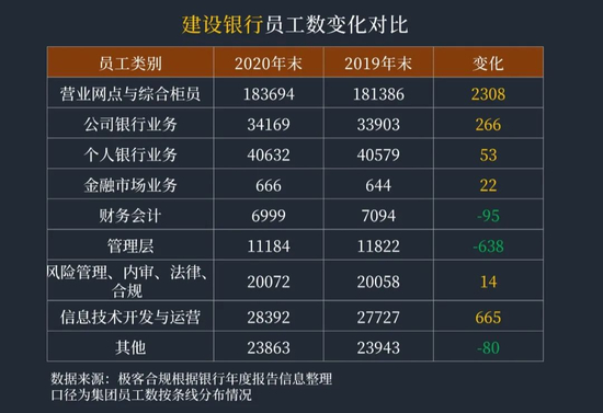 工商银行总体减少5775人,其中集团的个人银行业务、公司银行业务、运营与综合保障、经营管理、风险及合规管理、金融科技机构人员均有新增,尤其是金融科技机构和经营管理人员增加超过1万人。