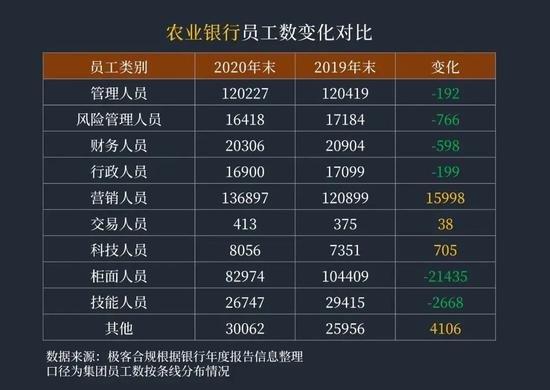 农业银行总体减少5218人,其中集团的营销人员、交易人员、科技人员均有新增,主要是柜面人员、技能人员、财务、行政、管理人员减少。
