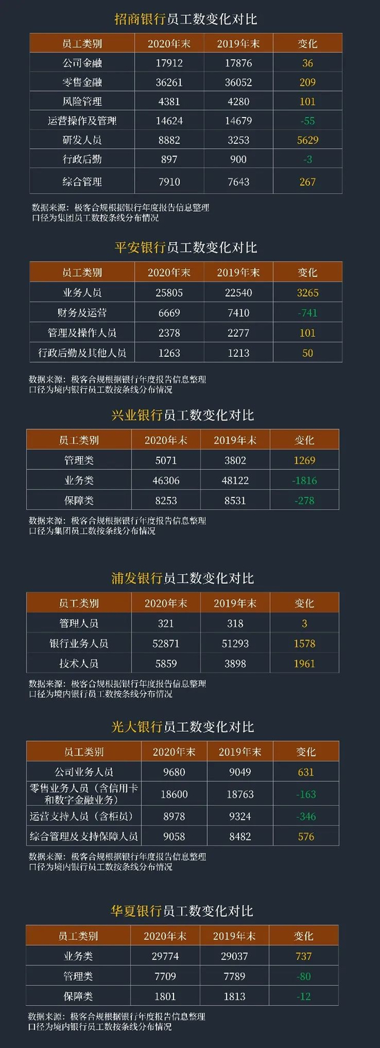 7、中信银行、民生银行、浙商银行、渤海银行2019和2020年度报告中对员工分布情况的统计口径不一致,不纳入对比;广发银行、恒丰银行未披露员工分布情况,不纳入对比。