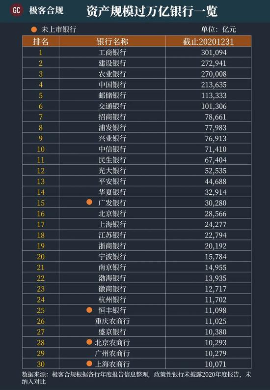 截止2020年12月31日,资产规模超过1万亿的银行有30家,包括6家国有大行、12家股份制银行、8家城商行、4家农商行。其中上市银行26家,未上市银行4家。(注:政策性银行未披露2020年度报告,未纳入对比)