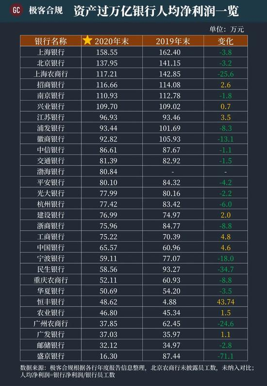 资产过万亿银行人均净利润