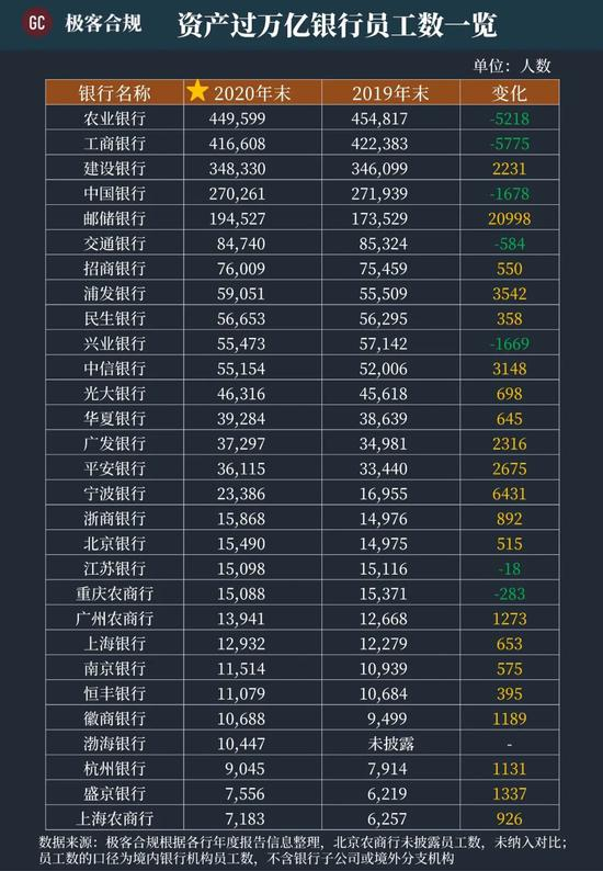 资产过万亿银行员工数一览