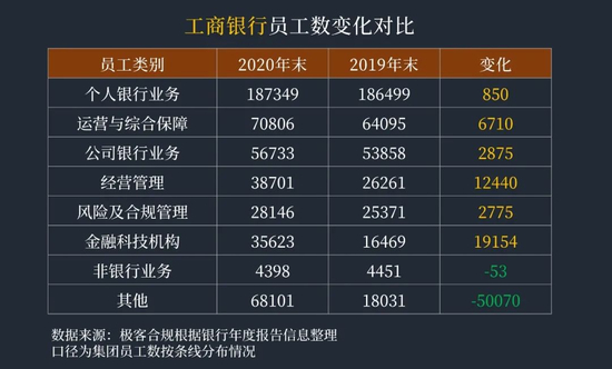 工商银行集团主要是其他类人员减少,2019年,其他金融业务及其他相关员工数68101人,2020年,新兴业务及其他相关员工数18031人,减少了50070人。