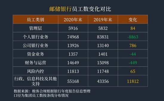 邮储银行集团个人银行业务、资金业务、财务与运营人员发生减少。
