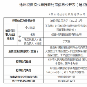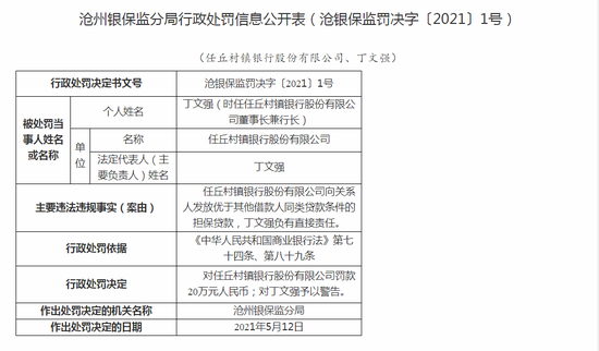 5月21日消息,中国银保监会沧州银保监分局行政处罚信息公开表显示,任丘村镇银行股份有限公司因向关系人发放优于其他借款人同类贷款条件的担保贷款,丁文强负有直接责任,对任丘村镇银行股份有限公司罚款20万元人民币;对丁文强予以警告。