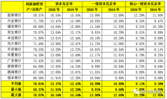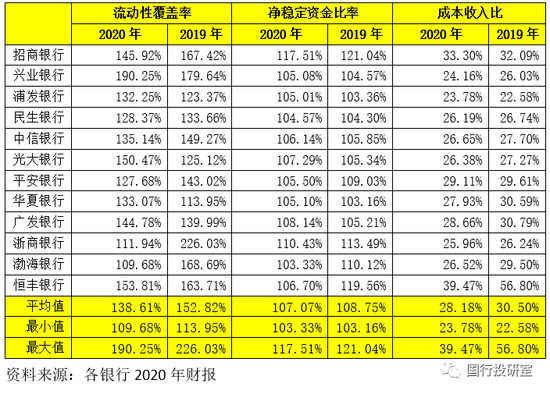 1、2020年,12家股份行的流动性覆盖率、净稳定资金比例平均分别为138.61%和107.07%,整体上看较2019年有一定下降。