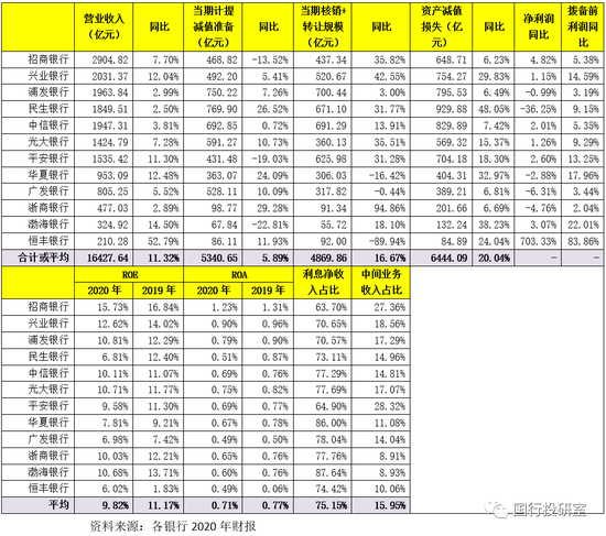 2020年12家股份行的ROE和ROA平均分别为9.82%和0.71%。其中,ROE较高的银行主要有招行(15.73%)、兴业银行(12.62%)、浦发银行(10.81%)、光大银行(10.71%)、渤海银行(10.68%),ROE较低的银行主要有恒丰银行(6.02%)、民生银行(6.81%)、广发银行(6.98%)和华夏银行(7.81%)。