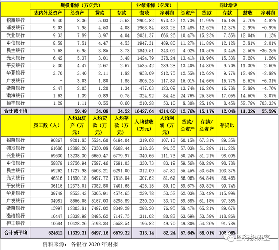 12家股份行共拥有52.46万名员工,总资产、贷款与存款合计分别为59.49万亿、34.08万亿、34.52万亿,合计实现16248亿元营收和4315亿元净利润。