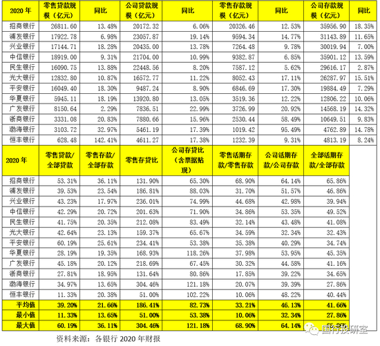(1)截至2020年底,12股份行的零售存款和贷款余额分别为8.11万亿和14.69万亿,公司存款和贷款余额分别为25.64万亿和17.36万亿,票据贴现合计为2.25万亿。显然,零售存贷比和公司存贷比(含票据贴现)的平均值分别为186.41%和82.73%,可以看出公司存款在股份行中多起到全行流动性的职能,重要性可见一斑。