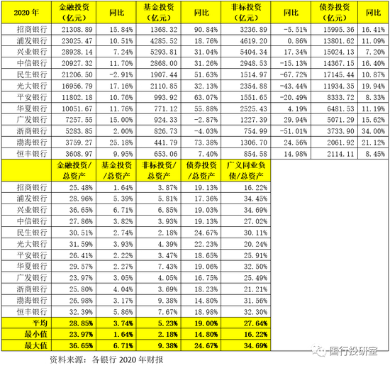特别是从增速上看,2020年民生银行、浙商银行、光大银行、平安银行、中信银行、招商银行等均在压降非标投资规模,尤以民生银行与光大银行最为明显。而对于债券投资和基金投资而言,股份行普遍加大了配置力度,这表明金融投资的内部结构调整是股份行正在做的事情。