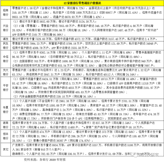 2、在关注借记卡和信用卡的卡量之外,目前多数股份行还会对零售客户进一步分类,如分为普通零售客户数、财富客户数、高净值客户数与私行客户数,同时对手机银行客户数、APP注册用户数与月活跃用户数等指标还特别重视。