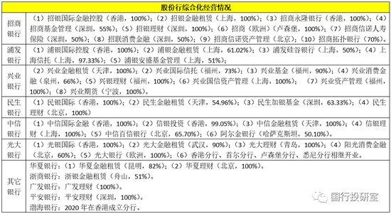 从综合化经营来看,股份行之间分化最为明显。